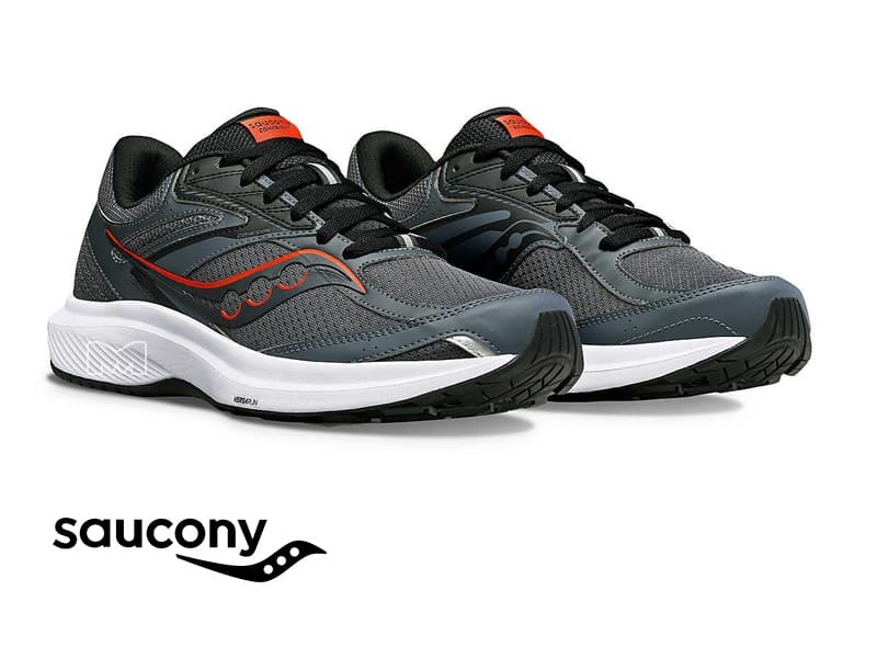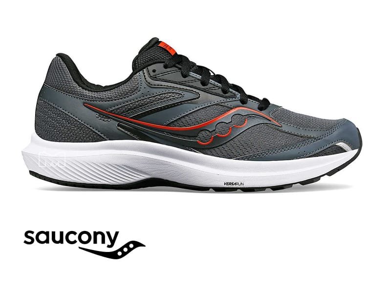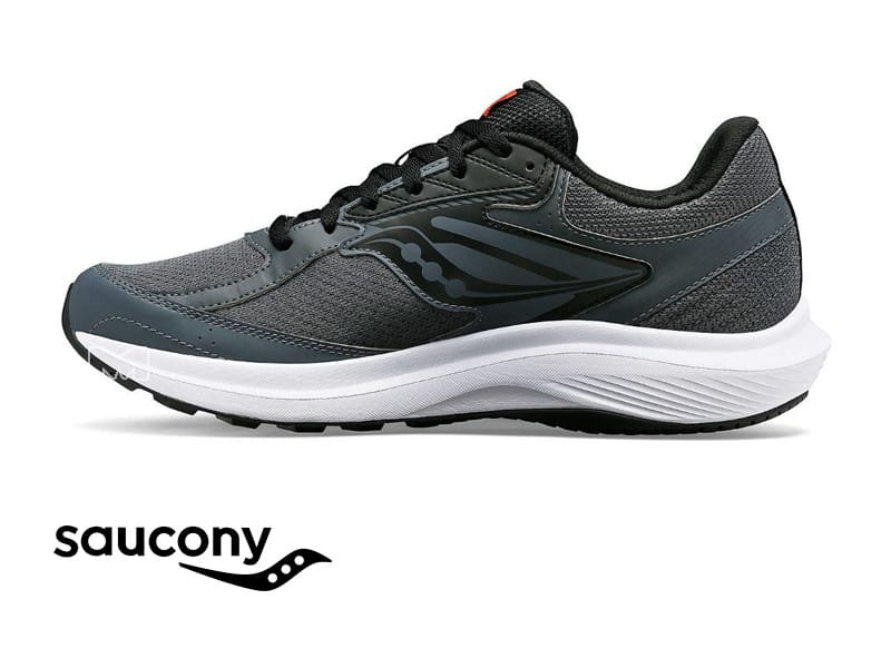 נעלי ריצה מבית חברת סאקוני, דגם COHESION רחב (WIDE).נעליים קלות ונוחות למטרות אימון שונות.גפת מרשת בשילוב בד בצבע אפור כהה וסוליה בלבן.